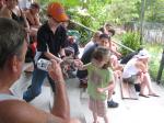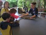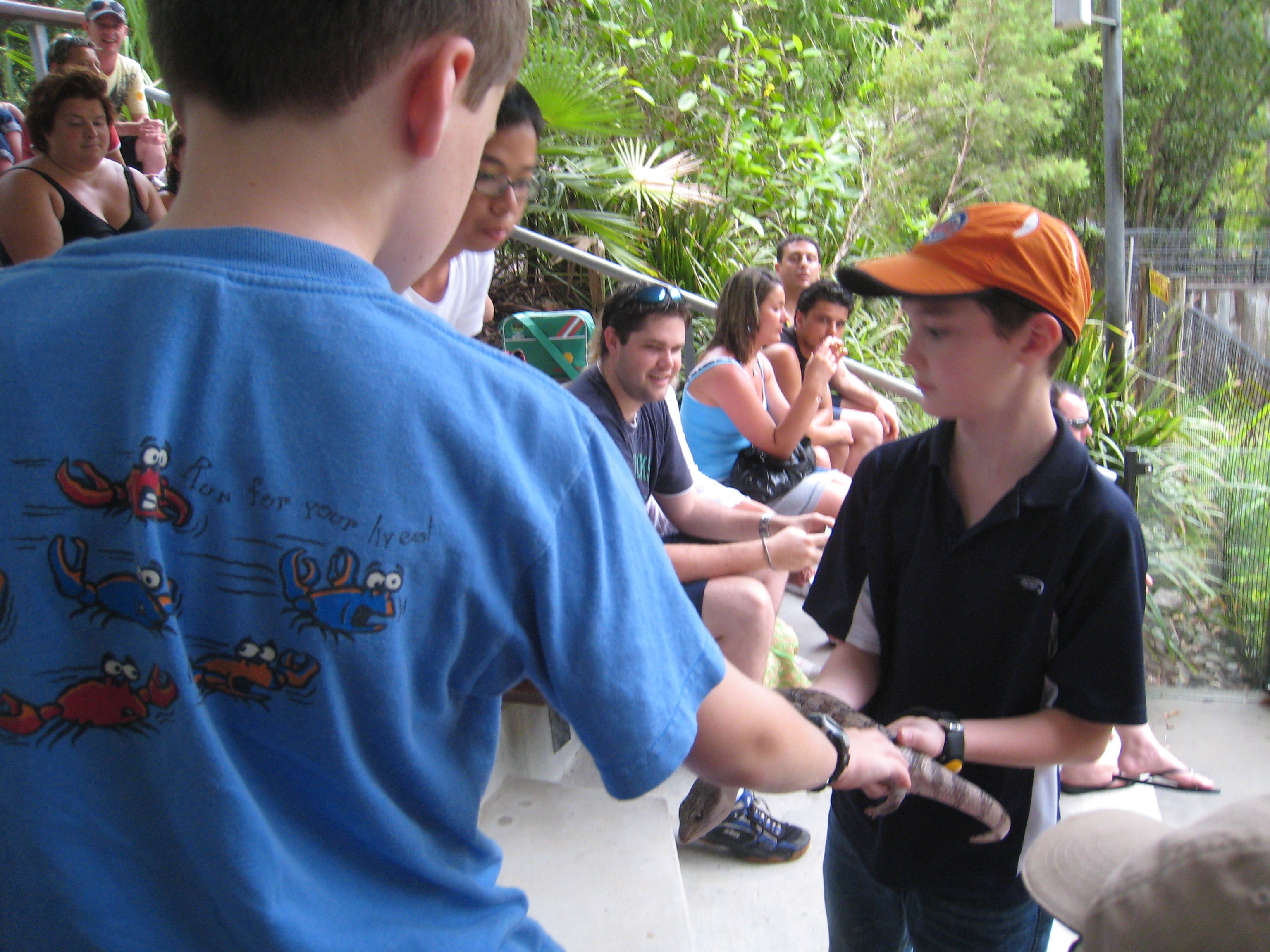 Christopher petting a blue-tongued lizard (Christopher is in the blue shirt)