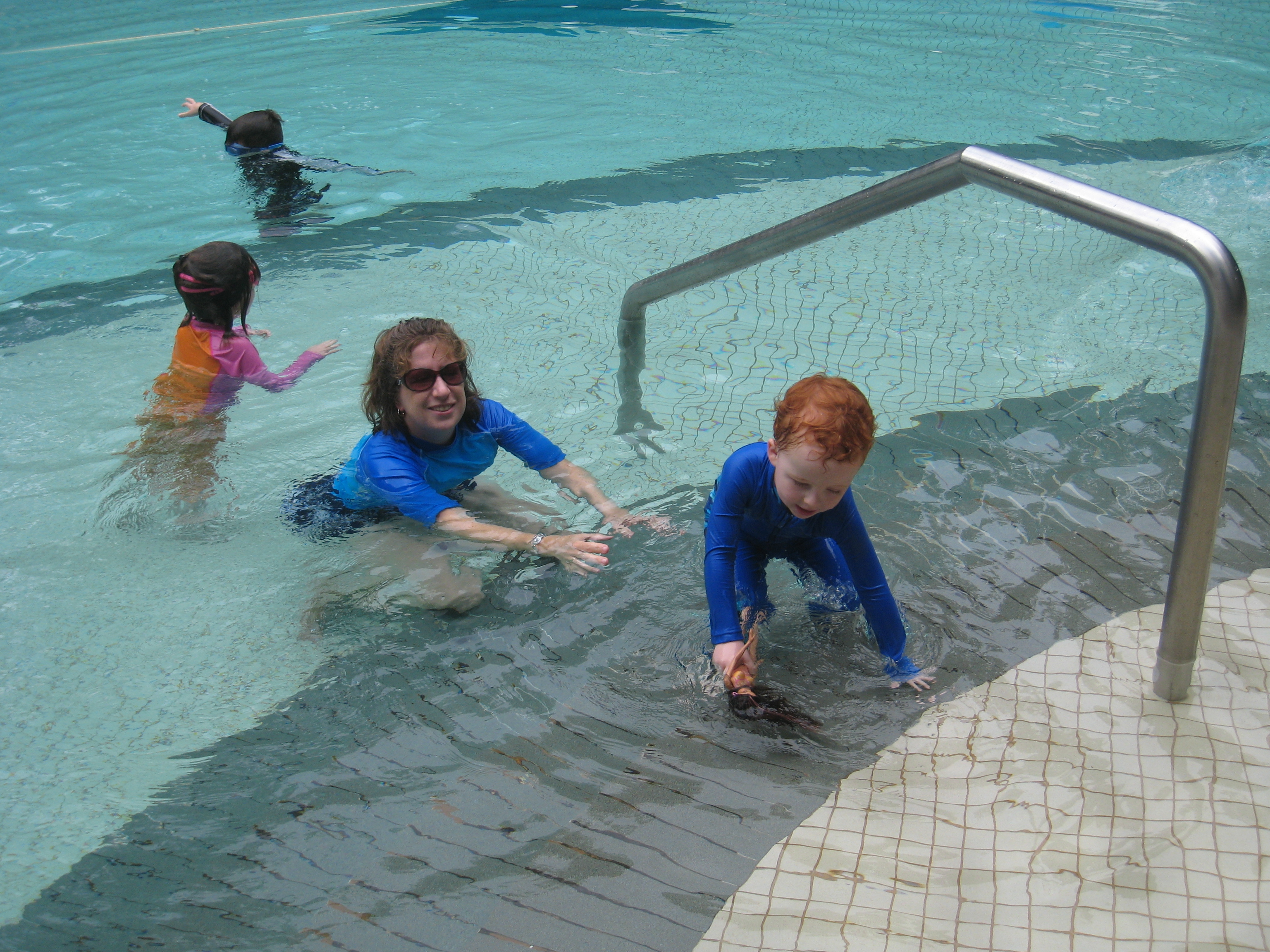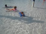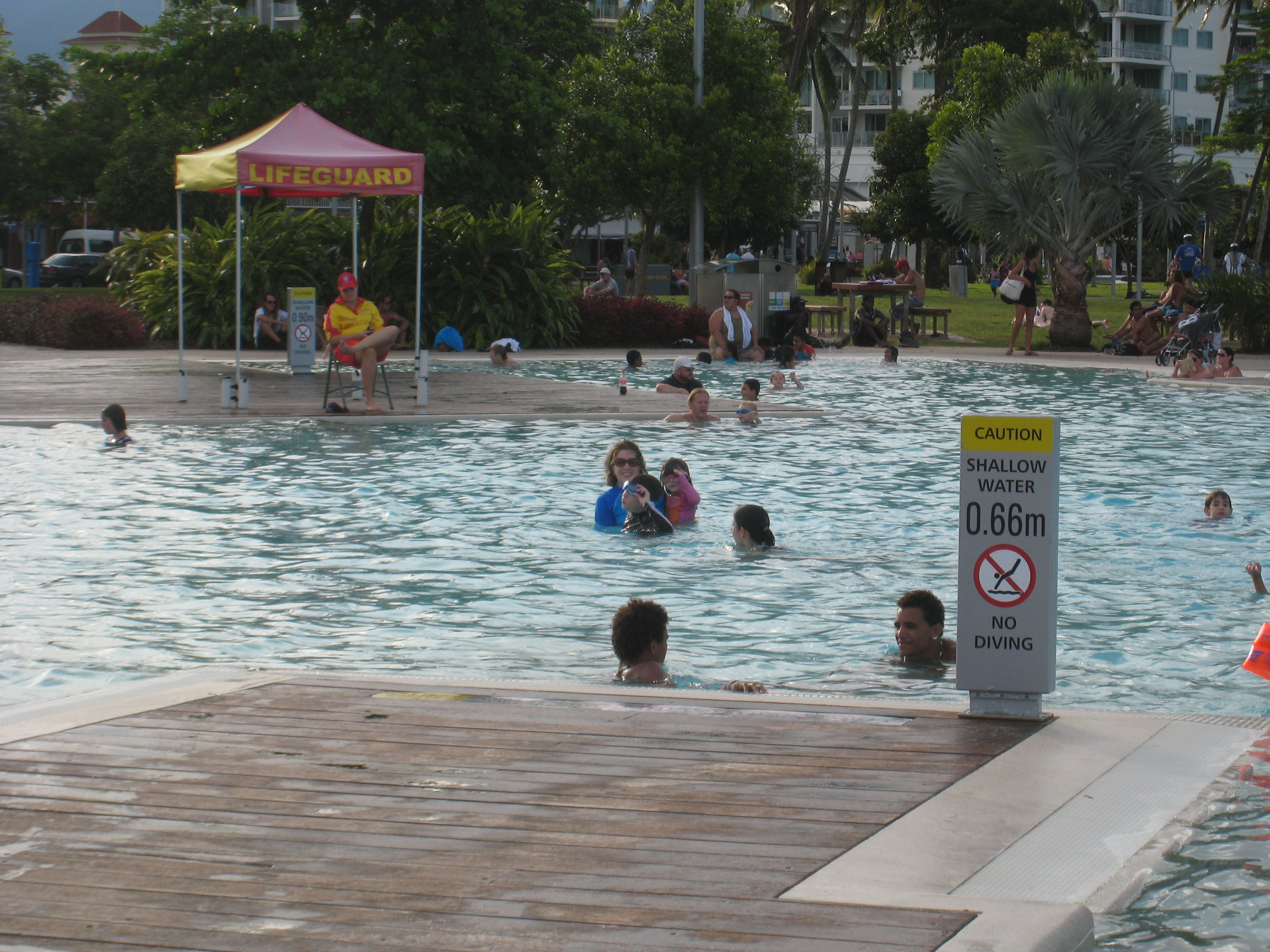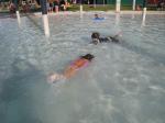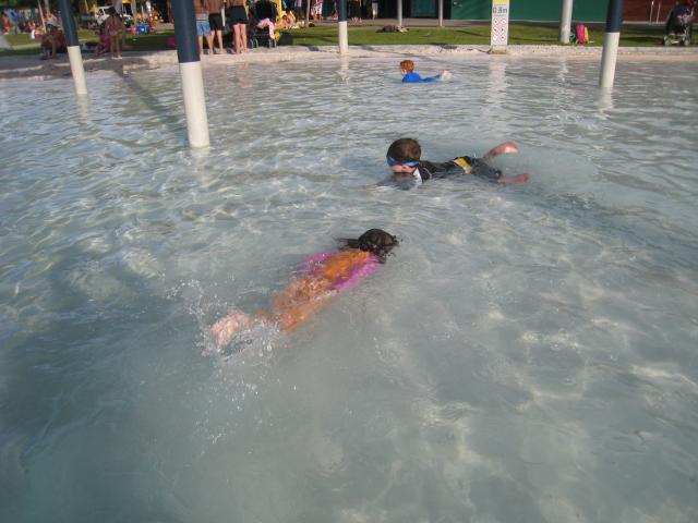Swimming in the Esplanade Lagoon, which is set up to look like a beach but spreads out into a huge, block-long swimming pool