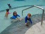 Brave girl, ear plugs and headband and all (to protect her left ear with the tube in it)!