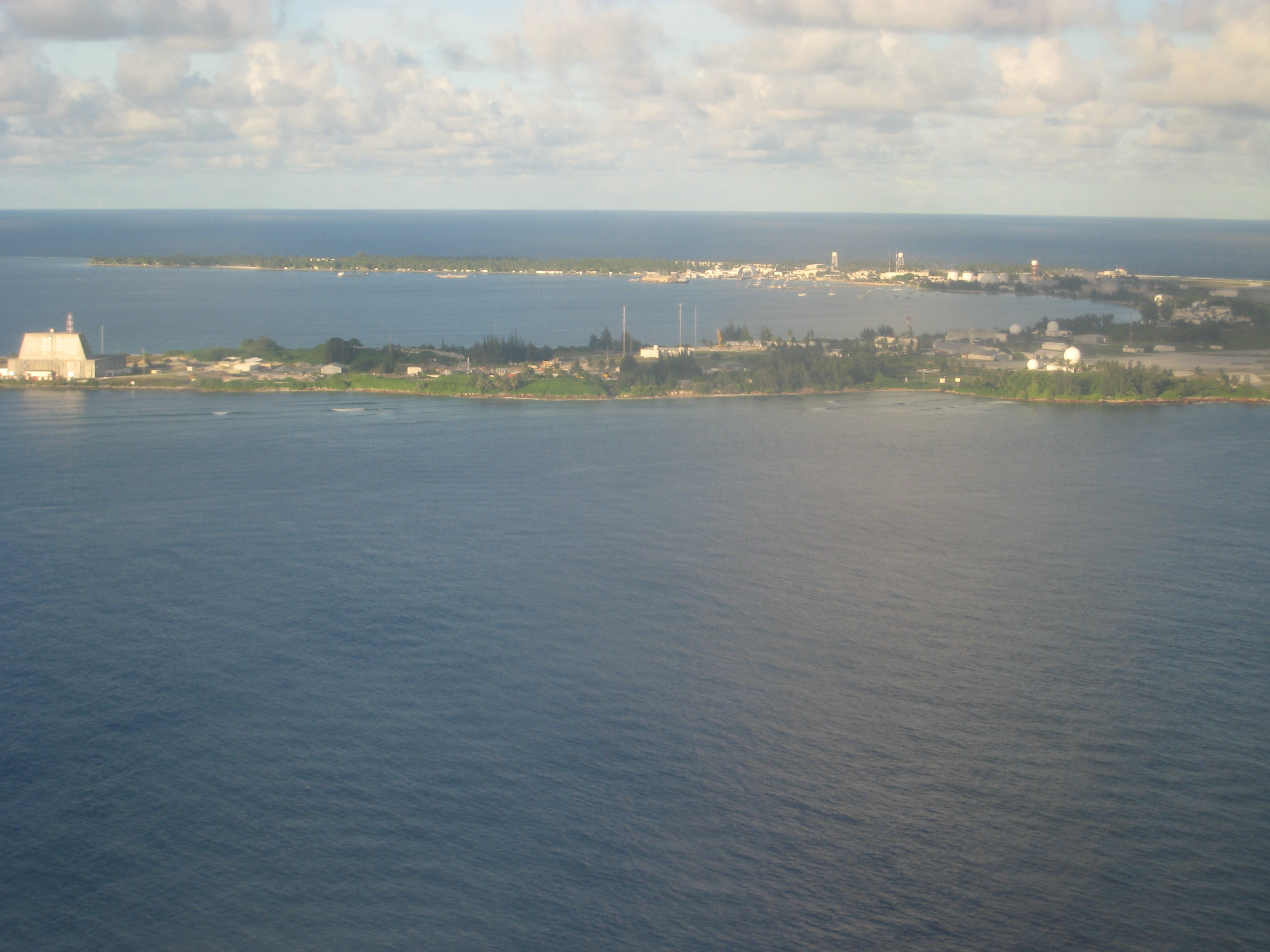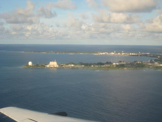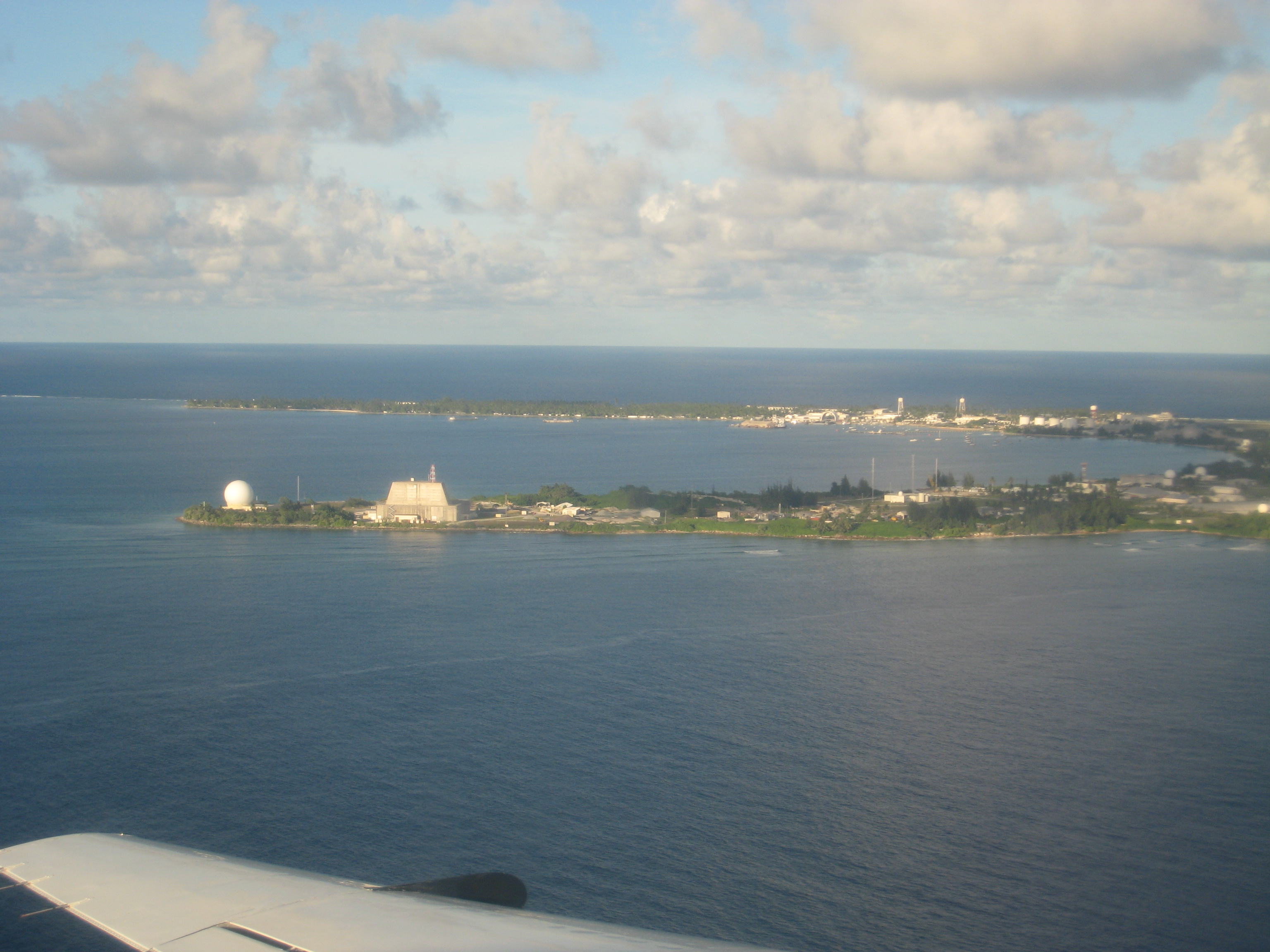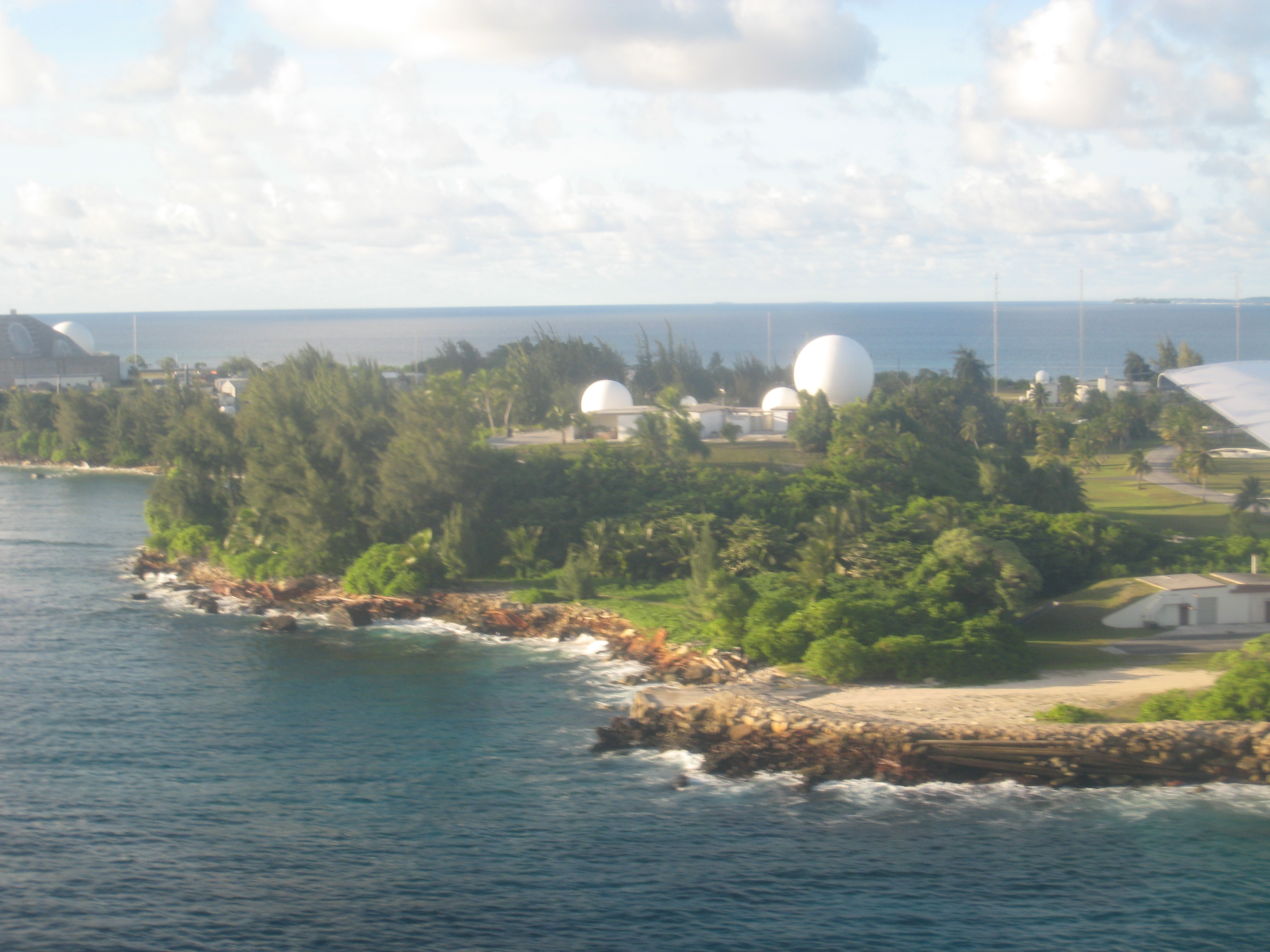 A view across the lagoon partially separating Roi and Namur islands. On the Namur side, you can see the KREMS radars: ALCOR (mostly behind TRADEX), TRADEX, MMW, and ALTAIR.