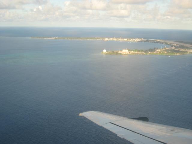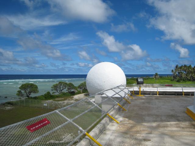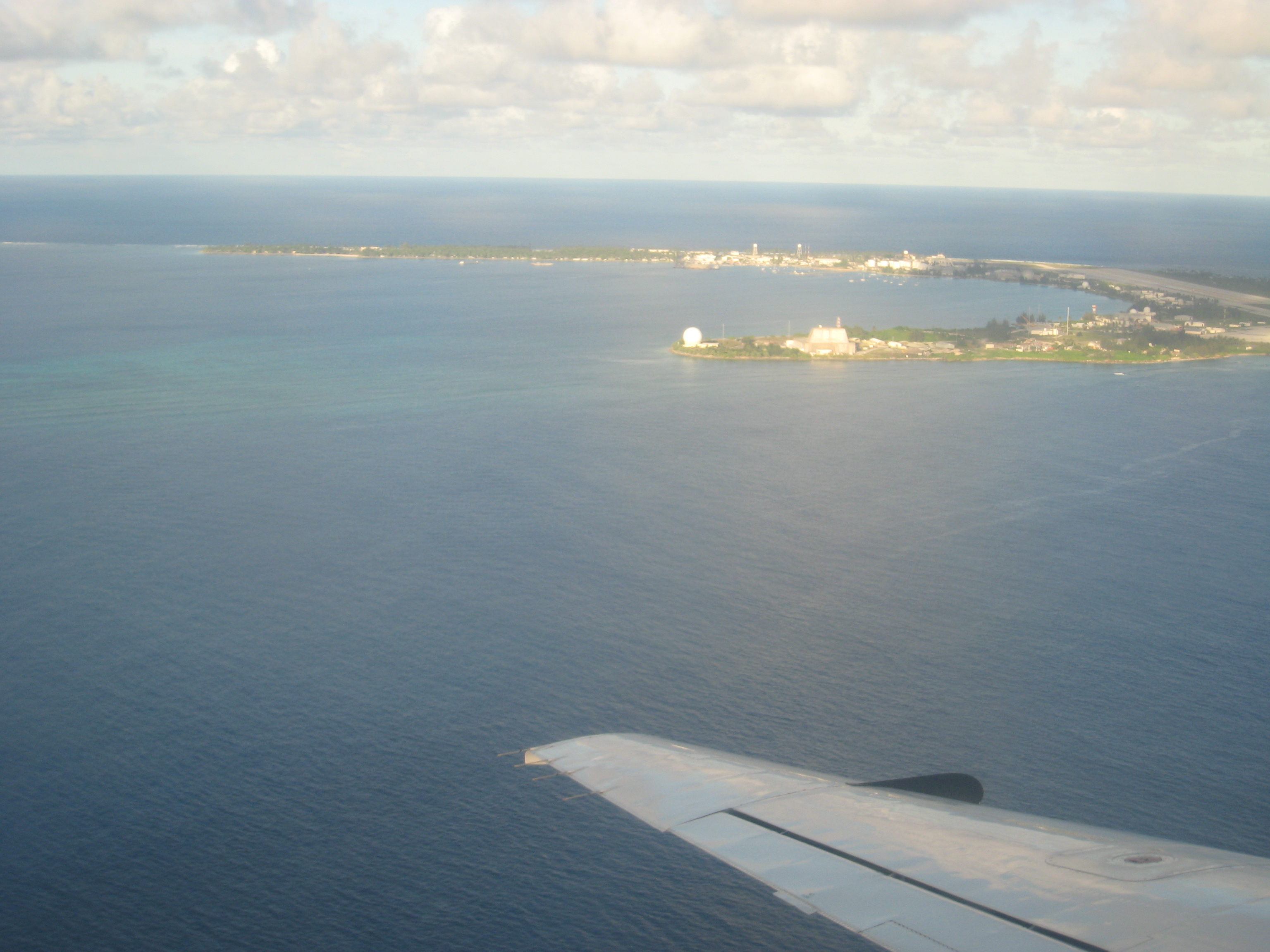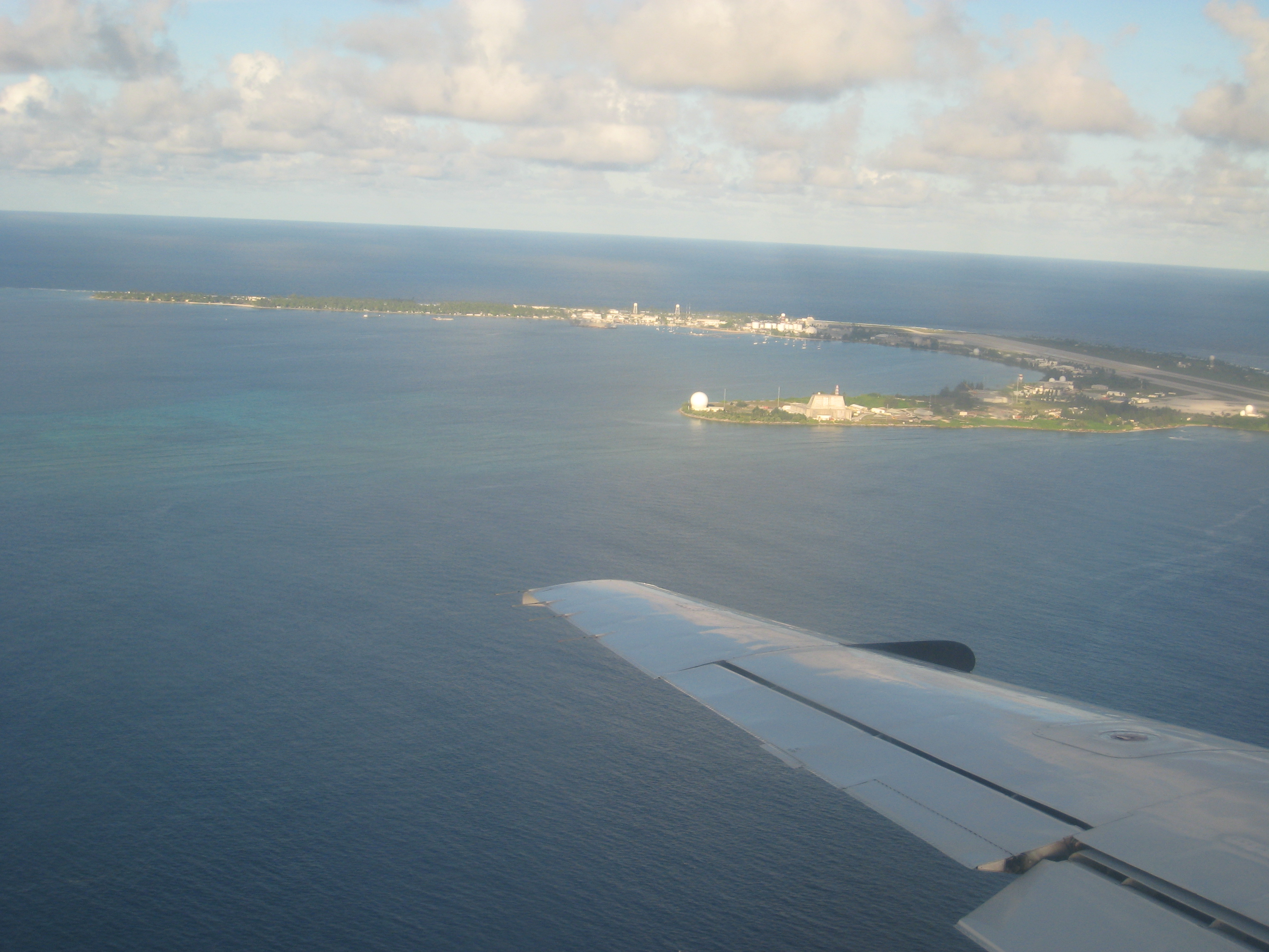 A view across the lagoon partially separating Roi and Namur islands. On the Namur side, you can see the KREMS radars: ALCOR (mostly behind TRADEX), TRADEX, MMW, and ALTAIR.