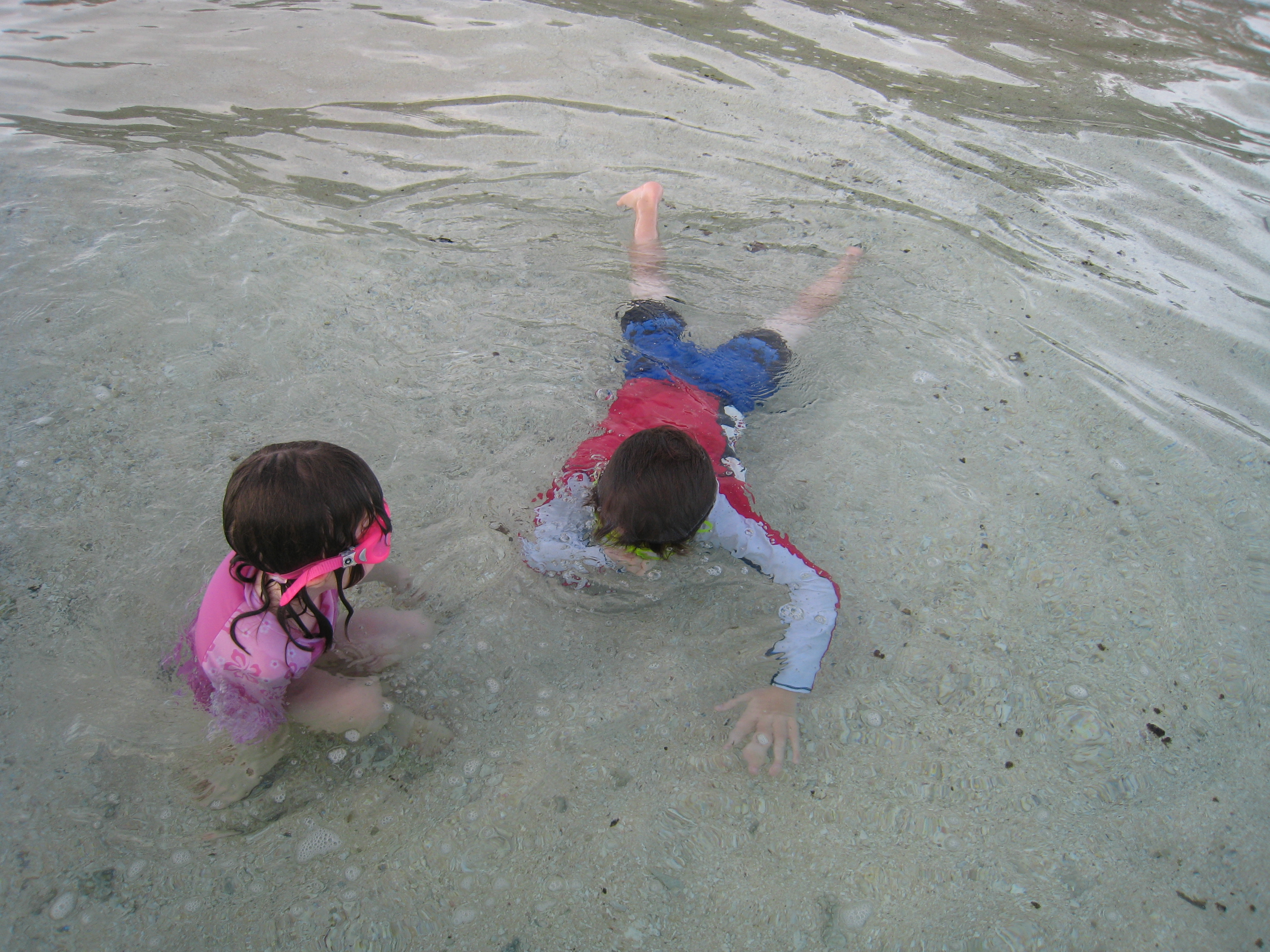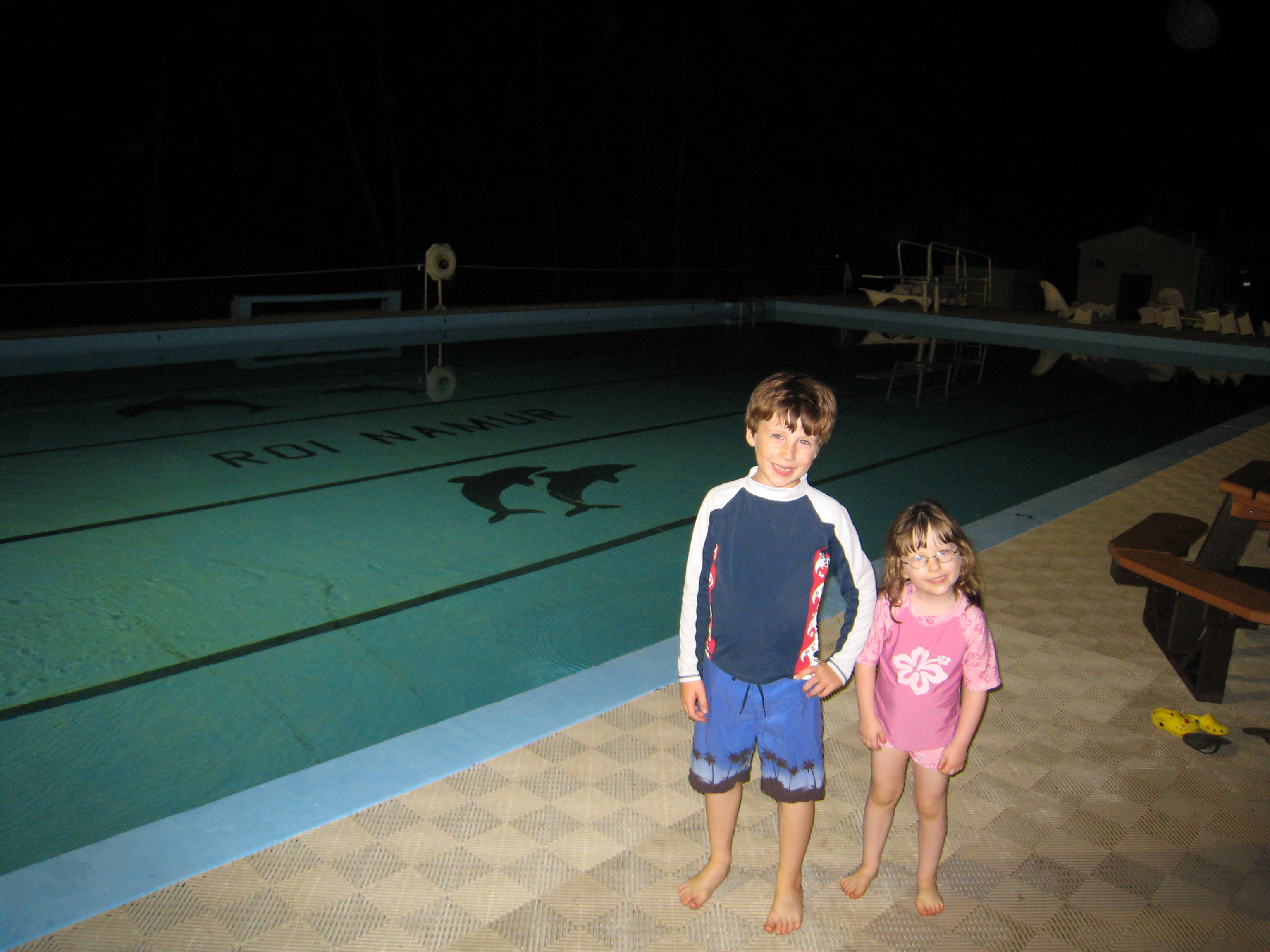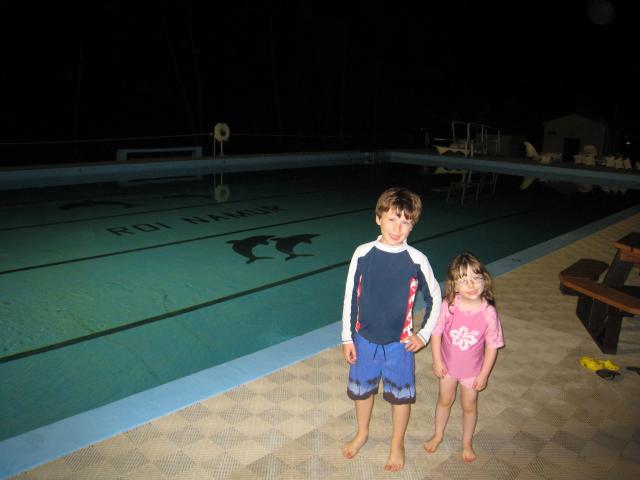 We took a flight to Roi on Saturday evening and found that kids are allowed in the pool on any day but Sunday. So, after having dinner in the dining hall, we went for a quick swim in the pool under the lights.