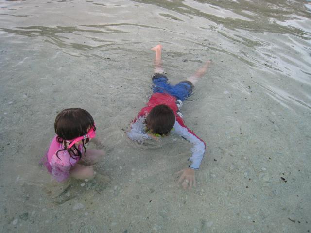 "Finally, Daddy's history lesson is through, and now we can swim!"