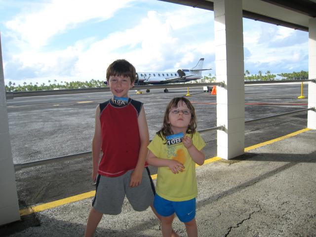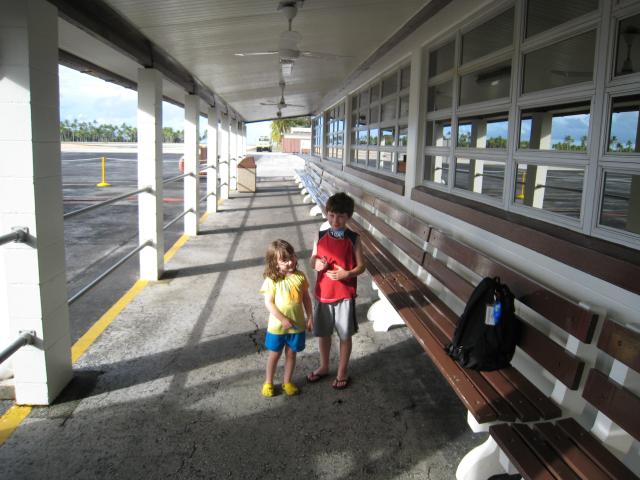 This is the outside waiting area, which becomes much more pleasant after someone turns on the fans. Most people remain inside the air-conditioned building until the plane is ready to leave.