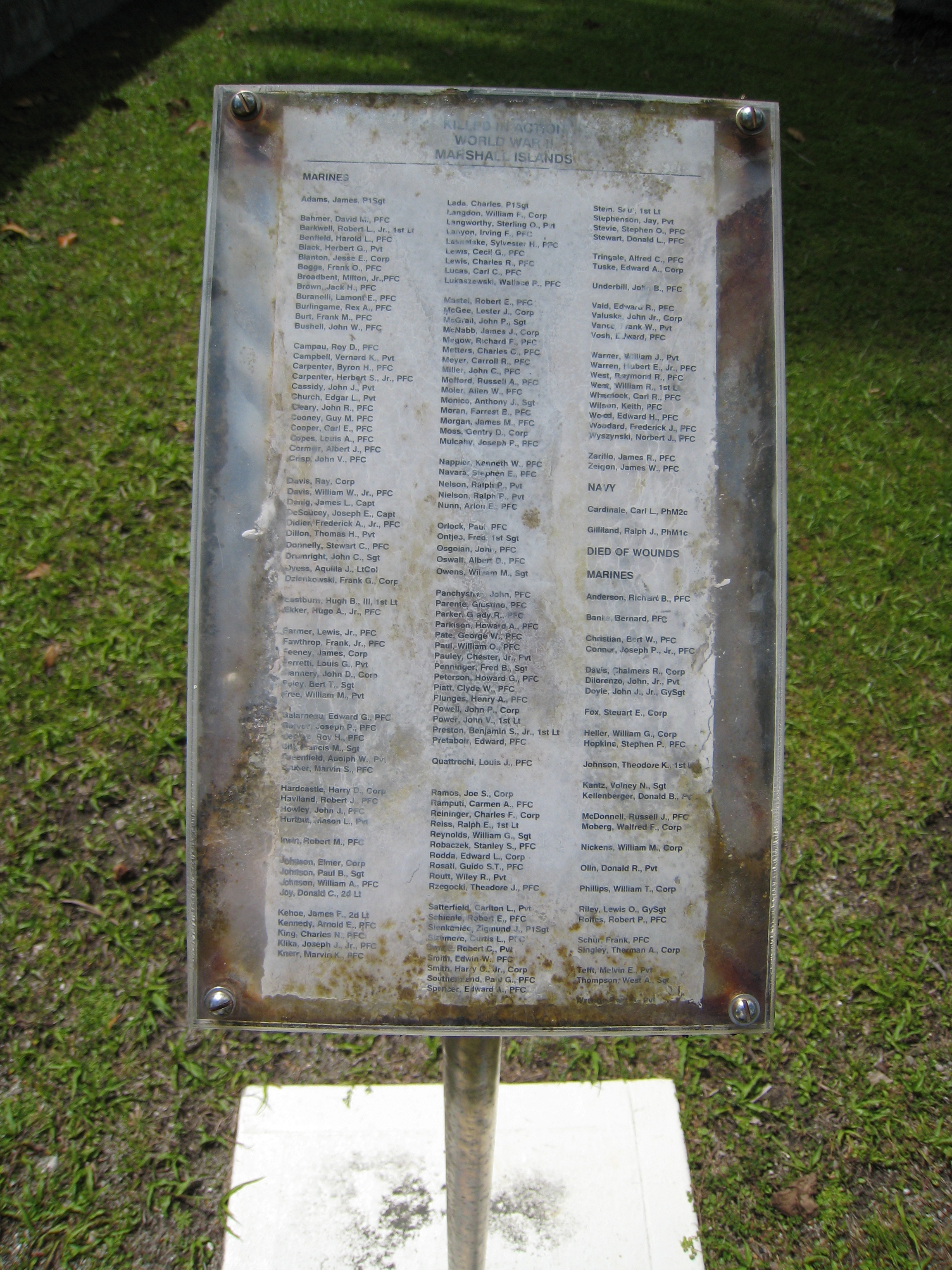 The sacrifice of American lives to drive the Japanese out of the Marshall Islands in WWII. Considering that the taking of Kwajalein Atoll was one of the more successful campaigns, we can truly see how costly WWII was.